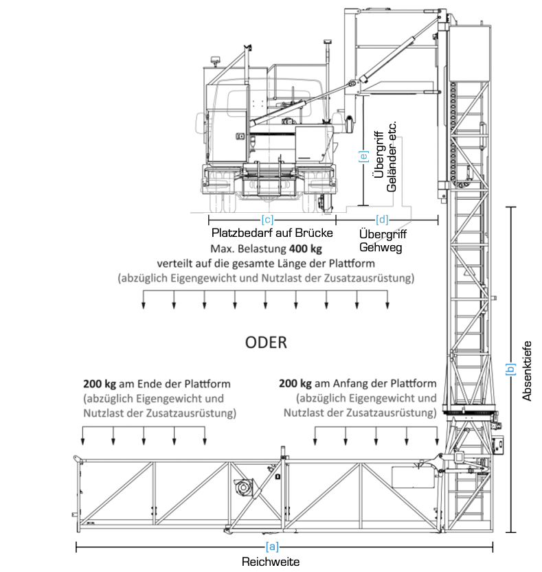 | Maximale Belastung Teleskop Stegende bei 11,0 m | 250 kg | |
